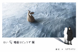 マッチボックスギャラクシー展での邂逅から約六ヶ月、愛媛県伊予市を拠点とする木彫り作家の青江と、松山市に逗留中のミタライケンによる二人展。頭の片隅に常に存在する闇は、実は光にもなりうる。その先へ