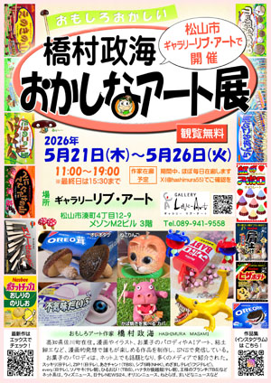 高知県佐川町出身の橋村正海の個展。漫画やイラスト、お菓子のパロディやAIアート、粘土細工など、漫画的発想で誰もが楽しめる作品を制作し、SNSで発信している。お菓子のパロディは、ネット上でも話題になり、多くのメディアで紹介されました。